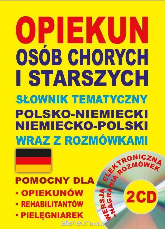 pomocny dla opiekunów, rehabilitantów, pielęgniarek w domach prywatnych i specjalistycznych placówkach - fachowe słownictwo medyczne - słownictwo ogólne przydatne w pracy opiekuna (prowadzenie domu, sprzątanie itp.) - wersja elektroniczna opracowania - rozmówki zawierające zwroty przydatne przy pracy z osobą chorą / niepełnosprawną (również w wersji audio) Opracowanie Opiekun osób chorych i starszych to specjalistyczna publikacja kierowana do osób wykonujących pracę opiekuna, pielęgniarza czy rehabilitanta w krajach niemieckojęzycznych. Publikacja składa się z części słownikowej oraz części z rozmówkami. Część słownikowa posiada zarówno układ polsko-niemiecki oraz układ niemiecko-polski i zawiera dwa typy haseł. Pierwszą grupę stanowią najbardziej potrzebne zwroty medyczne obejmujące najczęstsze schorzenia, badania, lekarstwa oraz metody i procedury terapeutyczne. Wszystkie hasła w tej grupie zawierają definicje. Bogaty zbiór haseł specjalistycznych sprawia, że publikacja może być przydatna również dla personelu świadczącego bardziej specjalistyczne usługi medyczne. Druga grupa haseł to bardziej ogólne słownictwo potrzebne w codziennej pracy opiekuna, pielęgniarza czy rehabilitanta. Hasła ogólne nie posiadają definicji, chyba że w danej sytuacji może zachodzić wątpliwość co do znaczenia. Hasła z obu grup są przedstawione w porządku alfabetycznym. Zarówno hasła specjalistyczne, jak i ogólne zawierają liczne przykłady użycia. Część z rozmówkami zawiera rozmówki polsko-niemieckie obejmujące ponad 350 zwrotów szczególnie przydatnych dla osób wykonujących pracę opiekuna. Rozmówki podzielone są na kilka grup tematycznych. Największą grupę stanowią zwroty bezpośrednio związane z opieką. Dodatkowo została opracowana grupa wyrażeń dotyczących prowadzenia domu, gotowania, warunków pracy. Dodano także rozdział z podstawowymi zwrotami. Zadania przedstawione w rozmówkach ujęte są kolejności logicznej / tematycznej i w niektórych przypadkach tworzą interakcje / dialogi z kolejnymi zdaniami. Do książki dołączono dwie płyty CD. Na jednej z nich znajduje się elektroniczna wersja opracowania, a na drugiej nagrania specjalistycznych rozmówek polsko-niemieckich.