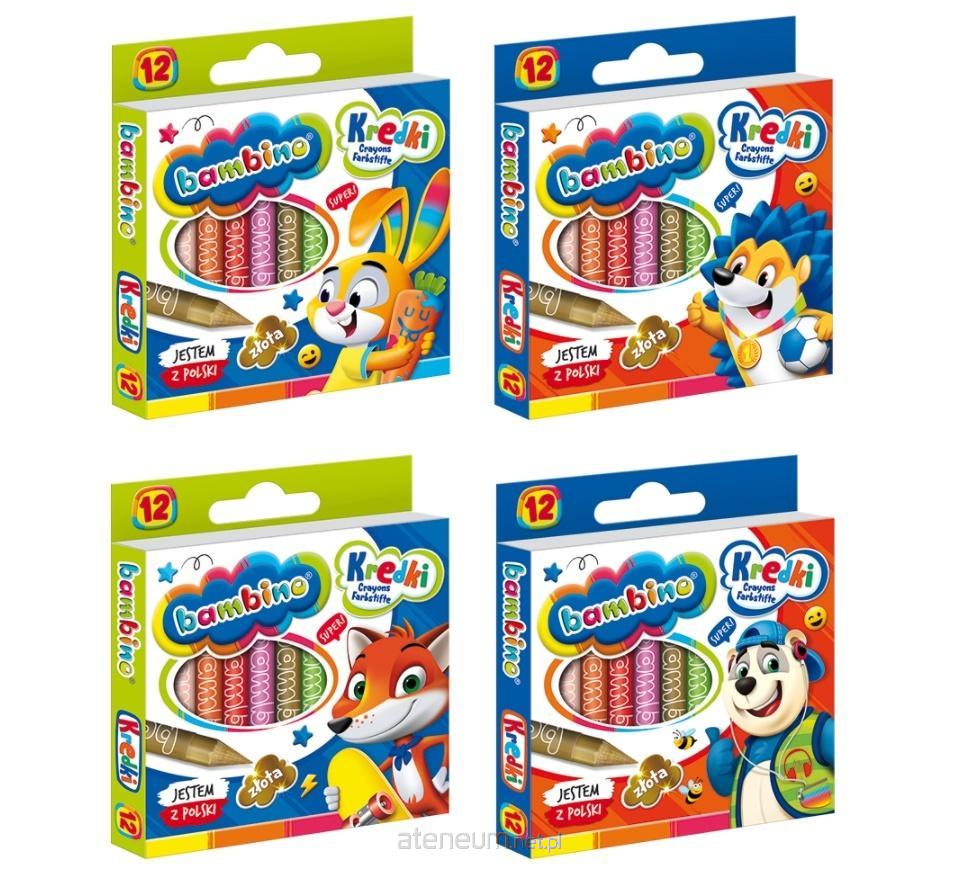 każda kredka posiada papierową ochronną owijkę z indywidualnym motywem graficznym ułatwiającym naukę i rozpoznawanie kolorów (na każdej kredce inne zwierzątko)
