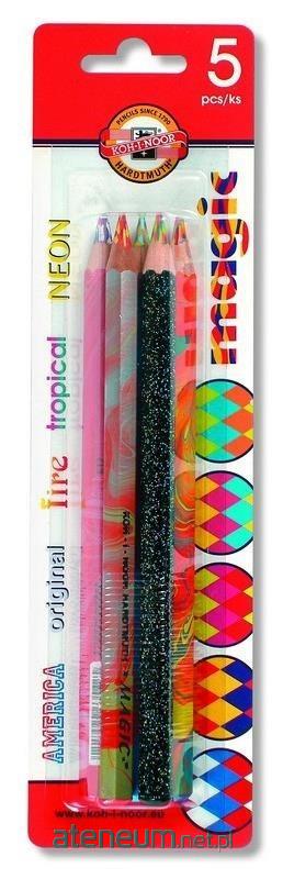 Kredka MAGIC KOH-I-NOOR z efektownym wielokolorowym wkładem. Umożliwiają tworzenie efektownych i niepowtarzalnych prac. Kolor kreski zmienia się w zależności od obrotu, nachylenia i zużycia kredki. Zestaw 5 sztuk o różnych kombinacjach kolorów.