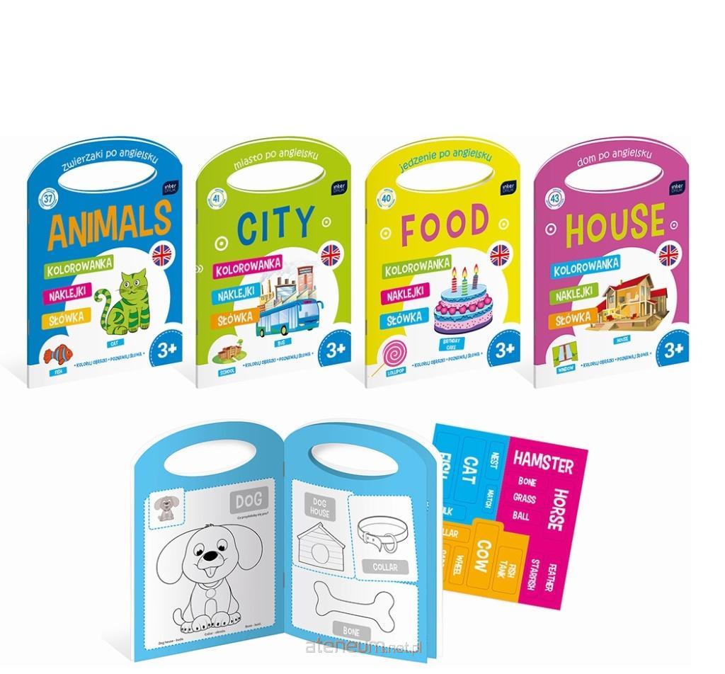 Format: A4. Liczba kartek: 16. Okładka pokryta błyszczącym lakierem. Kolorowanka tematyczna łącząca zabawę z nauką języka angielskiego dla dzieci powyżej 3. roku życia. Zawiera kolorowanki, naklejki i zadania pomagające w poznaniu i utrwaleniu słownictwa w języku angielskim. W serii znajdują się: Animals, City, Food, House.
