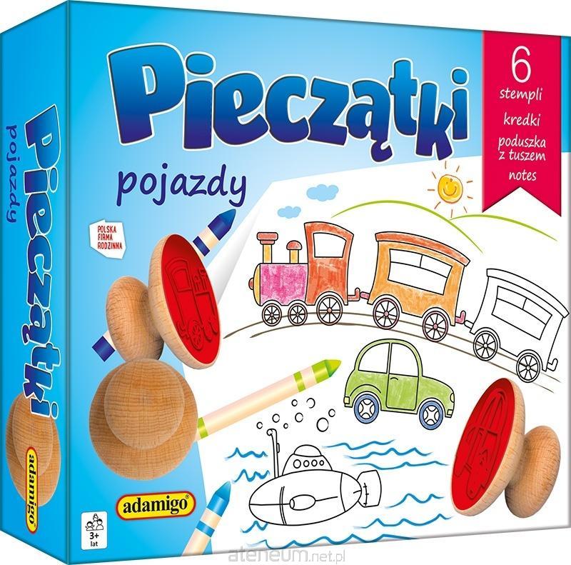 Zestaw 6 drewnianych pieczątek z pojazdami do kolorowania. W pudełku, oprócz stempli, znajduje się zestaw 12 kredek oraz poduszka z tuszem. Kreatywna zabawa dla najmłodszych!