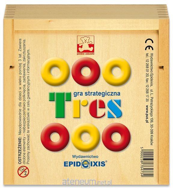 Tres to gra strategiczna, która wywodzi się z popularnej, wszystkim znanej gry w kółko i krzyżyk. Przeznaczona jest dla 2 graczy, których zadaniem jest zajmowanie na przemian pól na planszy poprzez nakładanie krążków w swoim kolorze na umieszczone na niej drążki. Każdy gracz dąży do tego, aby jak najszybciej zająć 3 miejsca w 1 linii: poziomo, pionowo, na skos w płaszczyźnie lub w przestrzeni jednocześnie utrudniając to samo przeciwnikowi. Wygrywa ta osoba, która jako pierwsza ułoży 3 swoje krążki w jednej linii. Dzięki temu, że gracze mogą układać swoje linie również na wysokość, gra jest dużo ciekawsza i bardziej emocjonująca. Wymaga skupienia i koncentracji. Pozwala ćwiczyć spostrzegawczość, myślenie logiczne i strategiczne. Tres znana gra, której nie znacie. Zawartość: drewniana podstawa 24 krążki w dwóch kolorach: 12 żółtych + 12 czerwonych instrukcja drewniane pudełko o wymiarach: 145 x 145 x 90 mm.