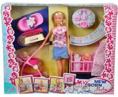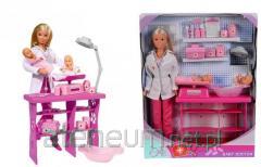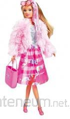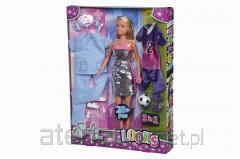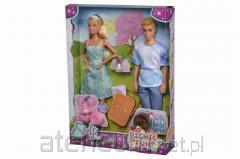 Lalki Steffi i Evi na treningu jazdy konnej, w strojach jeździeckich. W zestawie dolączono kucyka.
