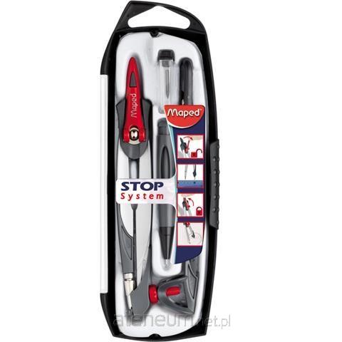 Metalowy cyrkiel z grafitową końcówką w plastikowym etui w zestawie z 4 elementami; uniwersalnym uchwytem na ołówek, zapasowym grafitem, temperówką do grafitów i ołówkiem automatycznym na grafity 0,5 mm. Opatentowany system blokady ramion w określonej pozycji. Specjalna nakładka na igłę zabezpiecza przed skaleczeniem. Jednostka sprzedaży 1 sztuka.
