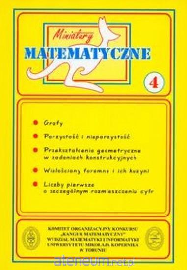 Organizowany od 1991 roku Międzynarodowy Konkurs ?Kangur Matematyczny zyskuje z roku na rok coraz większą popularność. Pragniemy podtrzymać tę dobrą atmosferę, dostarczając młodym uczniom zainteresowanym matematyką dodatkowego bodźca. Mamy nadzieję, że tę rolę spełnia seria książeczek ?Miniatury matematyczne, której czwarty tomik przekazujemy w Wasze ręce.GrafyParzystość i nieparzystośćPrzekształcenia geometryczne w zadaniach konstrukcyjnychWielościany foremne i ich kuzyniLiczby pierwsze o szczególnym rozmieszczeniu cyfr