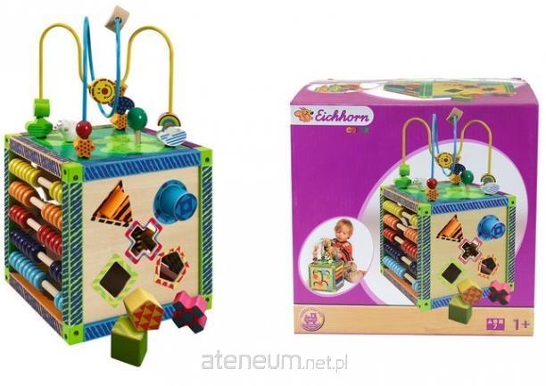 Kostka edukacyjna - centrum zabaw, to doskonała zabawka, stymulująca rozwój psychomotoryczny dziecka. Każda ściana ma inną funkcję. Znajdziesz tu labirynt z figurami geometrycznymi, drewniane klocki, które należy dopasować do otworów o takich samych kształtach, zegar do nauki odczytywania czasu, a także koła zębate o róznych wzorkach. Na szczycie sześcianu znajduje sie przeplatanka, która z pewnością zachwyci każdego malucha. Żywa i ładna kolorystyka to kolejny atut tej niezwykłej kostki.