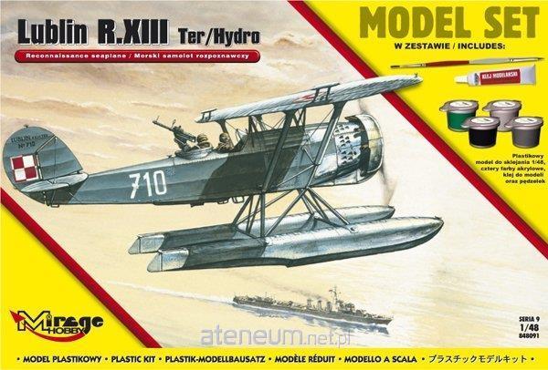 W latach 1933-1938 samolot Lublin R. XIII był najpopularniejszym samolotem łącznikowym. Wyprodukowano łącznie 288 samolotów wszystkich odmian z czego 10 wodnosamolotów Lubiln R.XIII ter/hydro. Od 1938 roku samoloty te były stopniowo wycofywane z linii i zastępowane przez nowocześniejsze samoloty RWD-14 "Czapla. Pomimo tego faktu lata międzywojenne należały do R. XIII. Służyły w lotnictwie towarzyszącym, morskim i sportowym. Brały udział w wizytach lotniczych i rajdach. We wrześniu 1939 roku lotnictwo wojskowe użytkowało jeszcze około 150 egzemplarzy samolotu R. XIII z czego 50 sztuk w pierwszej lini. W zestawie: - Plastikowy model do sklejania 1/48 - Cztery farby akrylowe - Klej do modeli - Pędzelek