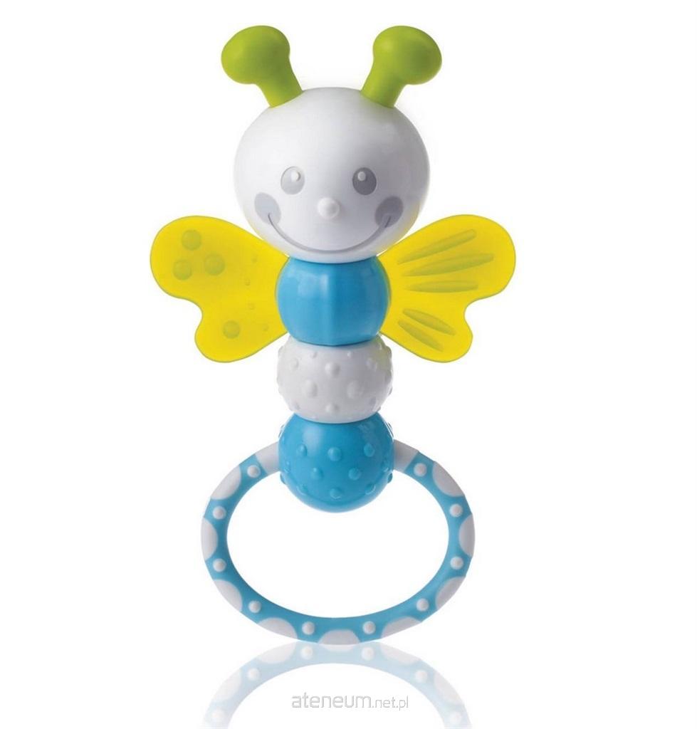 Uśmiechnięta grzechotka w kształcie pszczółki w pięknych kolorach. Zabawka delikatnie dzwoni przy potrząsaniu, a dzięki 6 różnym powierzchniom gryzienia przyniesie ulgę obolałym dziąsełkom