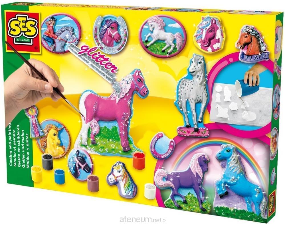 Odlewy gipsowe do samodzielnego wykonania. Duża forma z 14 wzorami do zrobienia reliefów z motywem koni. W zestawie również kolorowe farby, błyszczący brokat, pędzelek, gips plastyczny.
