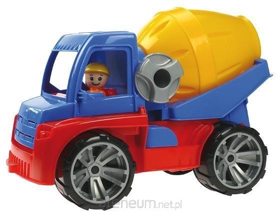 Kolorowa betoniarka o długości 29 cm, wykonana z elestycznego plastiku wysokiej jakości, spełniającego normy europejskie. Funkcjonalne autko, bęben można obracać oraz przechylić aby wysypać np. piasek. Kabina kierowcy unosi się. Pojazd z figurką.