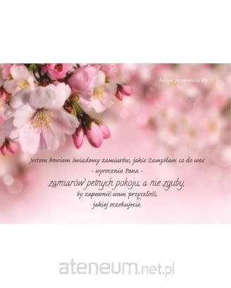 Kartka składana z kopertą. Kartka zawiera tekst z Księgi Jeremiasza 29,11 Ja bowiem znam zamiary, jakie mam wobec was - wyrocznia Pana - zamiary pełne pokoju, a nie zguby, by zapewnić wam przyszłość, jakiej oczekujecie. Każdy z nas potrzebuje przypomnienia, że Bóg ma dla nas najlepszą przyszłość. Warto przypominać o tym sobie nawzajem.