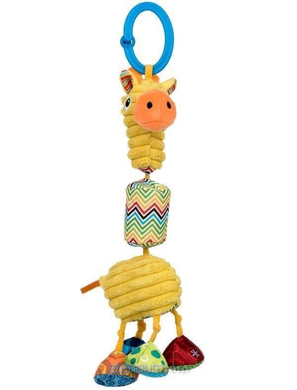 Ślicznotka Gabi ma najpiękniejszą szyję z wszystkich luzaków! Zdobią ją kolorowe wzorki, a przy każdym poruszeniu się dzwoni głębokim, metalicznym dźwiękiem. Jakby tego było mało, ta imponująca szyja pozwala Gabi obracać się o 360 stopni! Nic więc dziwnego, że podczas spacerków, kiedy smagają ją łagodne podmuchy wiatru, dzwoni z radości, podziwiając świat z poziomu dziecięcego wózeczka. Żyrafka stworzona została z materiałów o różnej fakturze, dzięki czemu zainteresuje maluchy i pomoże rozwija ich zdolności poznawcze.