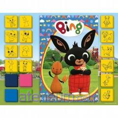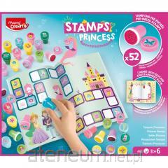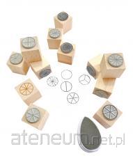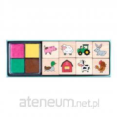 Zestaw kreatywny dla dzieci składający się z 6 pieczątek z wzorami zwierzątek (kotek, piesek, myszka, świnka, tygrysek, krówka), które można odbijać na kartce czarnym i czerwonym tuszem z poduszek znajdujących się w specjalnym, plastikowym pudełku. Odbite kształty można kolorować kredkami lub dodatkowo ozdabiać nimi swoje rysunki. 135 kolorowych naklejek urozmaica zabawę. Wszystkie elementy znajdują się w eleganckiej, funkcjonalnej wyprasce.