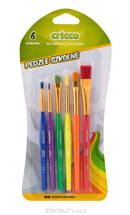 Komplet pędzelków szkolnych z kolorową akrylową rączką. Zestaw dostępny jest na blistrze i zawiera 6 sztuk pędzelków o różnych rozmiarach i kształtach końcówki.