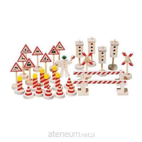 29-elementowy zestaw do zabawy w ruch drogowy zawiera m.in. 8 znaków ostrzegawczych, 4 sygnalizatory, dwa szlabany i figurkę dróżnika.