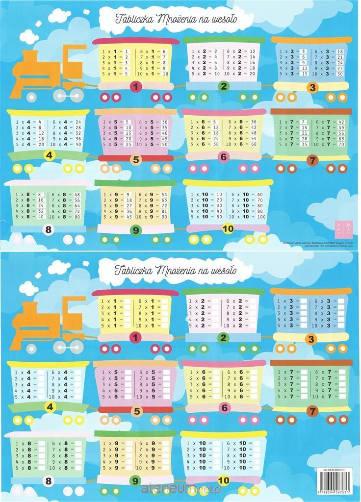 Podkładka na biurko - dwustronna, laminowana A2 tabliczka mnożenia wzór - POCIĄG. Plansza edukacyjna - tabliczka mnożenia może służyć jako podkładka na biurko. Na jednej stronie tabliczka mnożenia z wynikami. Na drugiej działania mnożenia 1-10 z pozostawionym pustym miejscem na wpisanie wyniku. To doskonały pomysł na ćwiczenie mnożenia. Na tablicy można pisać pisakiem suchościeralnym. Plansza foliowana dwustronnie.