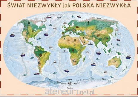 Świat niezwykły to bardzo plastyczna ścienna mapa dla dzieci wykonana w skali 1 : 30 000 000. Przed młodymi czytelnikami odsłaniają się tajemnice wielkiej różnorodności naszej planety pokazano wielkie łańcuchy górskie, równiny i wąwozy nie tylko na lądach, ale również na oceanach(!). Zaznaczono podmorskie łańcuchy górskie, wielkie rowy tektoniczne, głębie i szelfy oraz wynurzające się z podmorskich wulkanów wyspy. Na lądach stonowanymi kolorami zaznaczono wielkie siedliska roślinne takie jak równikowe dżungle, połacie wielkich lasów iglastych Syberii czy Kanady, ogromne obszary suchych półpustyń i pustyń w Afryce i Azji. Na tak przedstawionej powierzchni naszej Ziemi umieszczono rysunki charakterystycznych roślin i zwierząt z numerami, które umożliwiają ich opisanie poza mapą. Podpisano na niej kontynenty, większe wyspy, oceany i największe morza, a także największe łańcuchy górskie, niziny i wyżyny. Delikatne granice i opisy państw pokazują które kraje znajdują się na kontynentach, i z jakimi państwami sąsiadują. Mapa nadaje się jako ozdoba pokoju oraz źródło informacji o świecie.