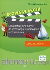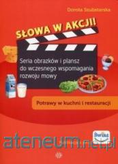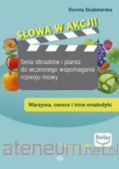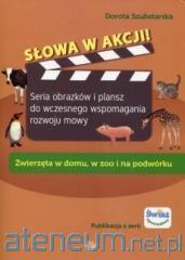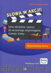 Małe dziecko nie uczy się słów. Nabywa mowę razem z wiedzą o świecie. Dlatego, aby bogacić słownikowy inwentarz, trzeba nasycić dziecko językiem zaangażowanym, czyli uczestniczącym w działaniu. Słowa w akcji to pomoc o prawie nieograniczonych możliwościach. To narzędzie, które pozwala ożywić język i nadać mu funkcje użytkowe. Połączenie obrazków, przedstawiających ubrania, zabawki i przybory szkolne, z uproszczonymi planszami, prezentującymi między innymi sklep odzieżowy czy salę przedszkolną, umożliwia wprowadzenie akcji, na przykład przymierzanie i kupowanie ubrań czy urządzanie kącika zabaw. Zatem dziecko nie tylko uczy się prostego na-zywania, ale bawiąc się, poznaje kolejne słowa w kontekście sytuacyjnym i gramatycznym zarazem. Publikacja stanowi twórczy sposób na wspomaganie rozwoju mowy małego dziecka.