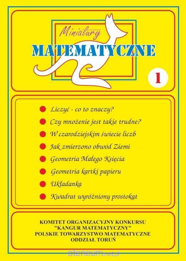 Organizowany od 1991 roku Międzynarodowy Konkurs Matematyczny Kangur Europejski zyskuje z roku na rok coraz większą popularność, szczególnie w kategorii "Maluch". Organizatorów cieszy masowość tego konkursu i ożywienie, jakie wnosi on w budzenie zainteresowań matematycznych. Pragniemy podtrzymać tę dobrą atmosferę dostarczając młodym uczniom zainteresowanym matematyką dodatkowego bodźca. Być może spełni tę rolę seria książeczek Miniatury Matematyczne, której pierwszy tomik przekazujemy w Wasze ręce. Znajdziecie w nim ciekawe i nieszablonowe teksty matematyczne, nie wykraczające jednak poza Wasze możliwości. Mamy nadzieję, że lektura tych tekstów zaowocuje jeszcze lepszymi wynikami w konkursie Kangur Europejski i pomoże Wam przygotować się do innych zawodów matematycznych. Wiele problemów zawartych w miniaturach wykorzystywanych było, z dobrym skutkiem, podczas zajęć Międzyszkolnych Kół Matematycznych prowadzonych przez Toruński Oddział Polskiego Towarzystwa Matematycznego. Spodziewamy się, że zawartość tej książeczki może pomóc kolegom nauczycielom w budzeniu i rozwijaniu uzdolnień matematycznych swoich wychowanków.