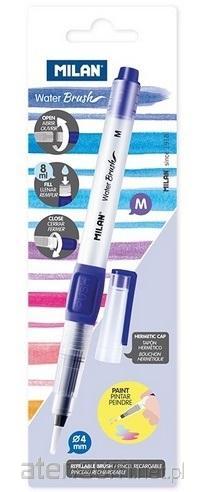 Pędzel wodny ze zbiorniczkiem na wodę 8 ml. Niezastąpiony przy pracy z farbami akwarelowymi, kredkami akwarelowymi, ołówkami i pastelami. Można stosować w użyciu z wodą ale także z tuszami i niemal wszystkimi rodzajami farb płynnych. Gumowy przycisk ułatwia i reguluje dawkowanie płynu. Końcówka z włosia syntetycznego o średnica 4 mm. Rozmiar pędzla: 13,5 x O 1,7 cm.