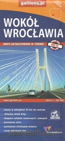 Mapa Wokół Wrocławia obejmuje Wrocław i obszar w promieniu do ok. 25 km ograniczony następującymi miejscowościami: Brzeg Dolny, Oborniki Śl., Trzebnica, Oleśnica, Jelcz-Laskowice, Oława, Sobótka, Środa Śl.Pokazano przebieg Autostradowej Obwodnicy Wrocławia, zaktualizowano zabudowę i nowe ulice w oparciu o najnowsze dane. Na mapie zaznaczono m.in. zabytki, ważniejsze noclegi, łowiska, stadniny koni oraz kąpieliska i baseny. Szczególnie atrakcyjne miejsca zaznaczono żółtą ramką. Podano aktualne przebiegi szlaków pieszych, rowerowych i kajakowych, łącznie z kilometrażem, co pozwala łatwiej zaplanować wycieczkę. Na mapie zaznaczono przebieg Szlaku św. Jakuba. W miejscowościach podano nazwy głównych ulic. Ukształtowanie terenu pokazano przy pomocy warstwic o cięciu co 5 m. Mapa posiada siatkę geograficzną opartą na elipsoidzie WGS 84, stosowaną w nawigacji.