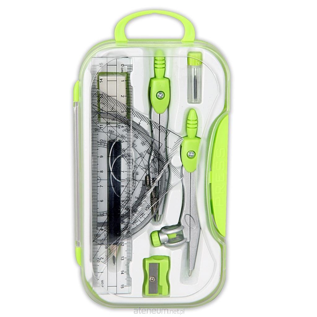 Zestaw składający się z dwóch cyrkli: metalowego z grafitem 2 mm oraz z ołówkiem, kompletu geometrycznego, temprówki i pojemnika na zapasowe grafity. Całość w kolorowym etui z zawieszką.