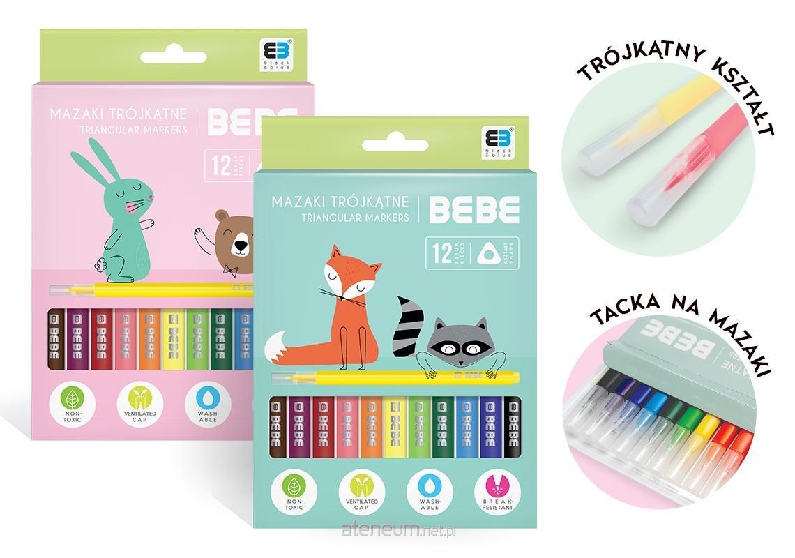 Mazaki o trójkątnym profilu w 12 kolorach. Nietoksyczne i zmywalne. Wentylowana skuwka. Produkt dostępny w 2 wersjach kolorystycznych.