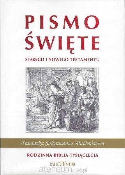 Biblia Rodzinna, będąca pamiątką sakramentu małżeństwa, zawiera tekst piątego wydania Biblii Tysiąclecia. Wydana została w dużym formacie i jest bogato ilustrowana grafikami Gustave'a Dor. Dodatkową zaletą tego wydania jest duża, czytelna czcionka. Jej rodzinny charakter podkreślają miejsca na wpisanie ważnych dat z życia członków rodziny. Zawiera również propozycje rodzinnych modlitw oraz obrzędów związanych z przyjęciem kolejnych sakramentów świętych. Biblia Tysiąclecia to najpopularniejsze narodowe wydanie Pisma Świętego. Zawiera jedyny polski tekst Pisma Świętego, zatwierdzony do stosowania w liturgii przez Konferencję Episkopatu Polski, przystępne komentarze - przypisy, mapy oraz podręczny słownik biblijny. Dodatkowa, ozdobna obwoluta sprawia, że ta wersja Biblii staje się jeszcze bardziej wyjątkowa i doskonale nadaje się na prezent z okazji zawarcia sakramentu małżeństwa.