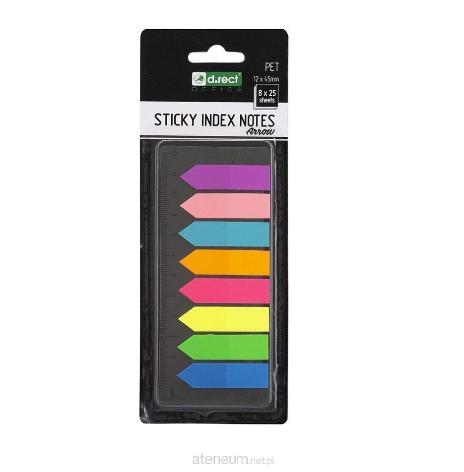 Zakładki indeksujące w kształcie strzałki, do zaznaczania wybranych fragmentów tekstu lub całych stron. Wykonane z folii PET, ze stabilnym klejem, który umożliwia wielokrotne przyklejanie i odklejanie zakładki, nie niszcząc powierzchni. Każdy komplet to 8 neonowych kolorów po 25 zakładek, rozmiar zakładki 12 x 45 mm. Opakowanie zawiera dodatkowo linijkę 12 cm.
