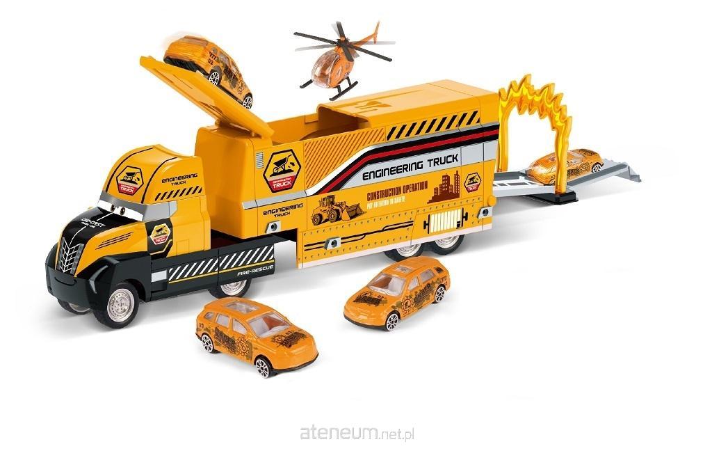 Fantastyczna ciężarówka roboty drogowe wraz z dwoma modelami aut i helikopterem.
