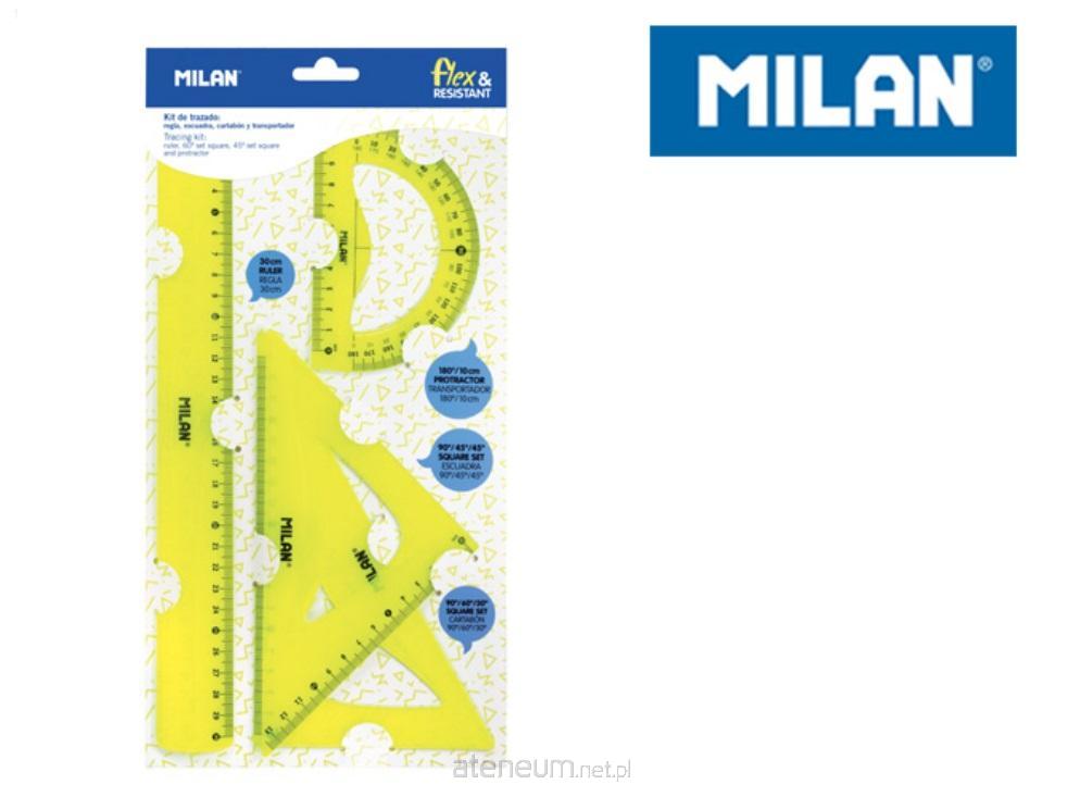 Zestaw geometryczny MILAN. Przezroczysty w kolorze neonowym żółtym. Linijka 30 cm, ekierka 30/60, ekierka 45/45, kątomierz. Wykonana z elastycznego i trwałego materiału (Flex&Resistant), co utrudnia jej złamanie. Skośna krawędź zapobiega zabrudzeniom.