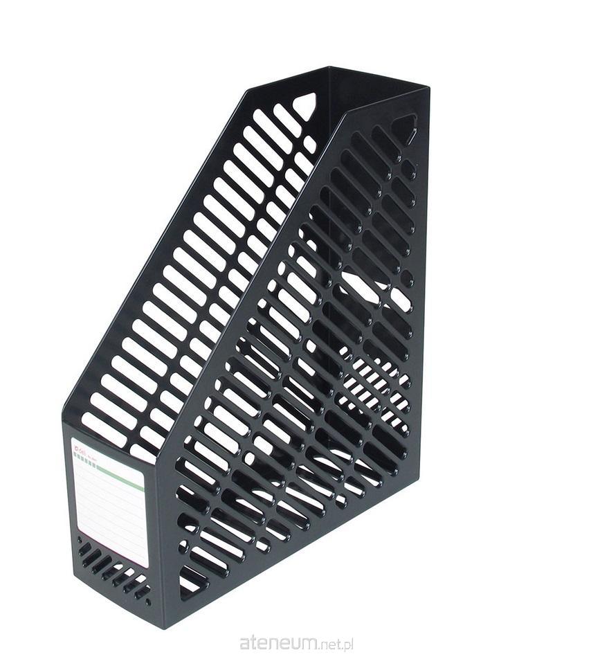 Ażurowy pojemnik do przechowywania czasopism i dokumentów w formacie A4, o szerokości 9 cm. Solidny, wykonany z wytrzymałego, niełamliwego plastiku, posiada etykiety do opisu zawartości i otwór na palce ułatwiający wyjmowanie pojemnika z półki.