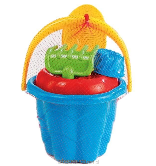 Zestaw zawiera 7 elementów: wiaderko, sitko, grabki, łopatkę, 3x foremki.