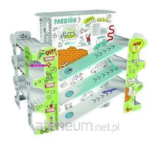 Kartonowe szablony do złożenia i pokolorowania. Dzięki zawartości tych pudełek i własnej wyobraźni dzieci stworzą niepowtarzalny parking i ozdobią go na tysiąc różnych sposobów. Można kolorować kredkami, flamastrami i farbami. Papierowe budowle mają lekką, ale stabilną i trwałą konstrukcję, a co najważniejsze, gwarantują długie godziny doskonałej zabawy. Zdjęcie pokazuje złożone i pokolorowane szablony. Wymiary parkingu po złożeniu: 410 x 320 x 485 mm