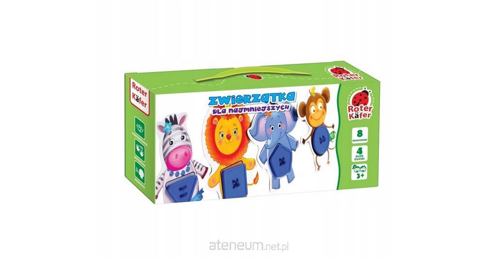 GRA EDUKACYJNA: ZWIERZĄTKA DLA NAJMNIEJSZYCH Słoniątko, małpeczka, lew i zebra zapraszają malucha do wspólnej nauki figur geometrycznych. Wszystkie kartonowe elementy zwierzątek są dwustronne. Z jednej strony przedstawiono chłopczyka, a z drugiej dziewczynkę. Także na każdej ze stron jest pewna figura geometryczna. Maluch powinien uważnie przyglądać się zwierzątkom i narysowanym figurom oraz dobrać guzik o odpowiednim kształcie. Jeśli guzik został dobrany prawidłowo, następnie należy go przymocować do figurki zwierzęcia przy pomocy specjalnego sznurka. Gra trenuje drobną motorykę, logiczne myślenie, pamięć i mówienie.