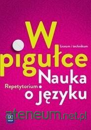 Repetytorium W pigułce zawiera zwięzłe omówienie zagadnień z zakresu nauki o języku określonych w nowej podstawie programowej dla liceum i technikum. Przypomina także podstawowe wiadomości z klas IVVIII. Informacje zostały przedstawione w sposób uporządkowany i czytelny, z wykorzystaniem licznych przykładów. Przystępny przekaz ułatwi uczniom szybkie powtórzenie wiadomości. Repetytorium będzie cenną pomocą przez cały okres nauki w liceum lub technikum. Publikacja szczególnie przydatna dla maturzystów, dlatego że zbiera i przypomina wiadomości sprawdzane na egzaminie maturalnym z języka polskiego zwłaszcza w części ustnej.
