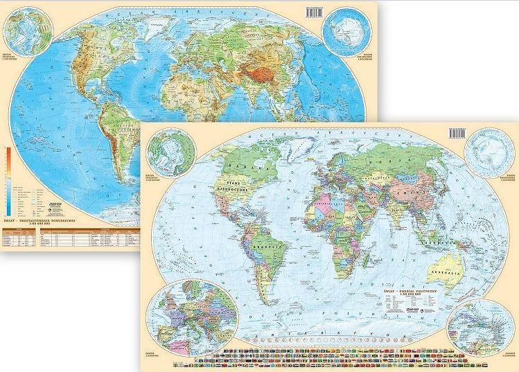 Znakomicie przygotowana, dwustronna podkładka na biurko z mapą świata w skali 1:60 000 000, polityczną (awers) oraz fizyczną (rewers). Prezentuje najważniejsze, aktualne informacje o kontynentach świata. Ciekawie zaprojektowana, oprócz map, mieści również dodatkowe elementy, pomocne w poznawaniu świata. Może być świetną pomocą w przyswajaniu wiedzy z zakresu geografii na poziomie szkoły podstawowej i gimnazjum. Na mapie politycznej można znaleźć: - podział polityczno-administracyjny świata z granicami państw, - stolice i najważniejsze miasta, - flagi państw. Na mapie fizycznej zaznaczono: - ukształtowanie terenu z górami, szczytami, rzekami, rzekami itp., - wyodrębnione kolorem krainy geograficznie, - najważniejsze miasta, - dodatkowa tabelka z wylistowanymi najwyższymi szczytami, najdłuższymi rzekami, --najgłębszymi jeziorami. Podkładka zabezpieczona jest trwałym laminatem, na którym można umieszczać swoje notatki, oznaczenia itp., używając suchościeralnych mazaków.