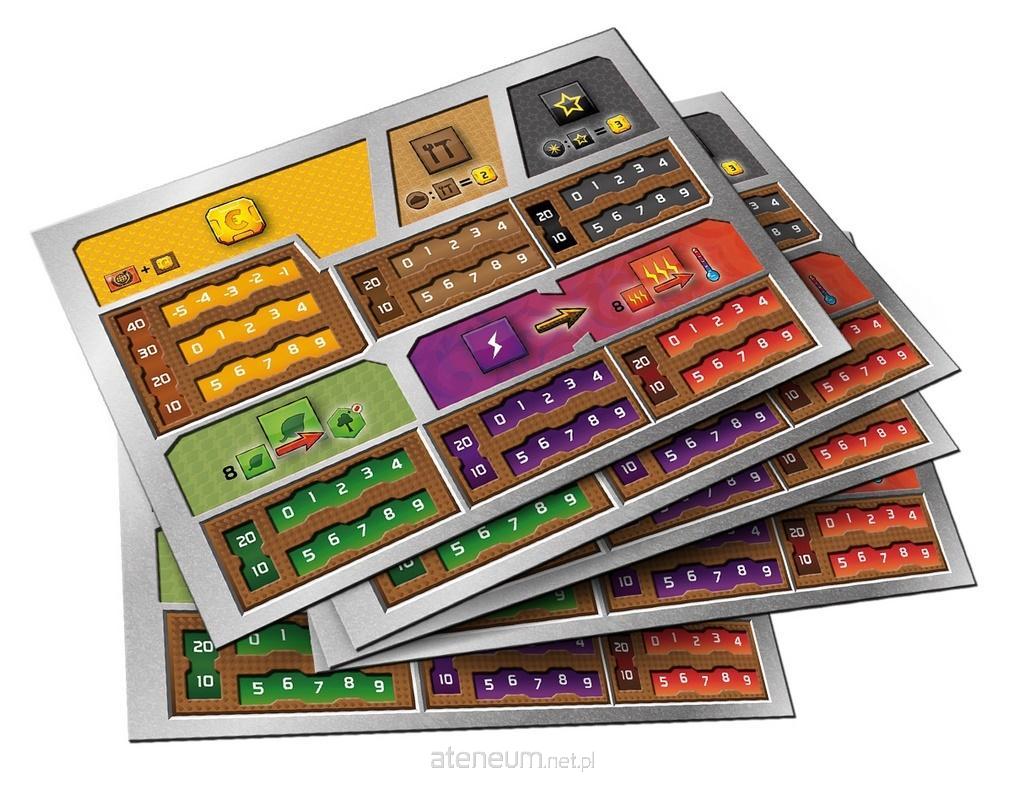 Uwaga! To nie jest samodzielna gra! Do rozgrywki wymagana jest podstawowa wersja gry: Terraformacja Marsa (edycja Gra Roku). Uporządkuj swoje surowce! Denerwują cię przesuwające się kostki surowców? Twoi znajomi mają tak zamaszyste ruchy, że potrafią w sekundę przerobić stal na tytan? Często coś ci się nie zgadza i nie możesz się doliczyć, na jakim poziomie produkcji byłeś? Koniec z tym! Zestaw 5 plansz graczy sprawi, że na zawsze zapomnisz o powyższych problemach. Dzięki obramowaniu poziom produkcji zaznaczamy na sztywno specjalne miejsce zostało stworzone dokładnie na wymiar kości graczy. Ramka strzeże również wyprodukowanych przez nas surowców, dzięki czemu utrzymujemy porządek i unikamy przypadkowych błędów w liczeniu.