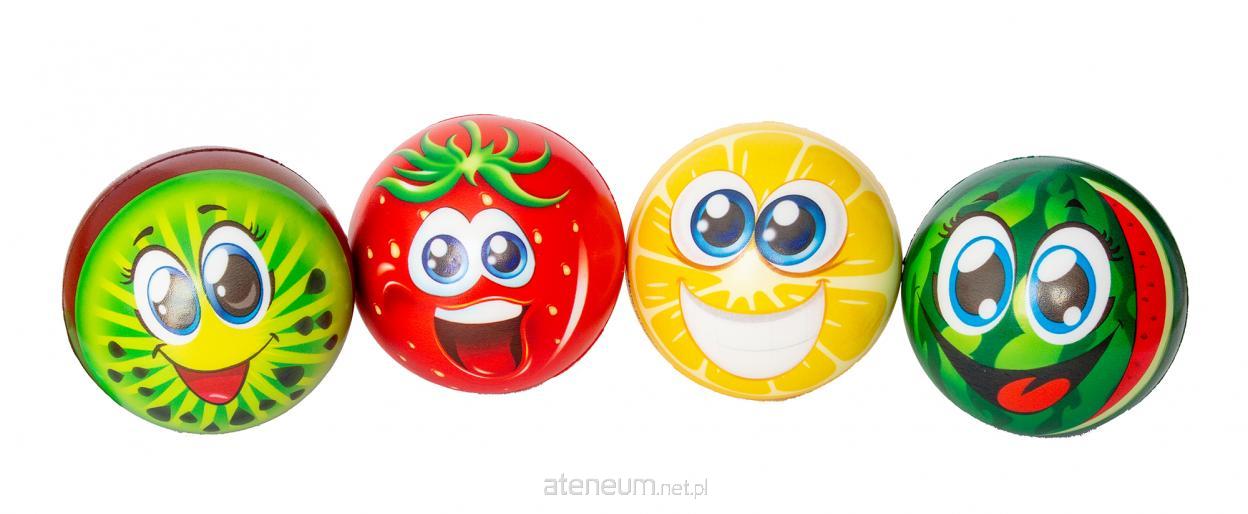 Kolorowe piłeczki we wzory wesołych owoców do zabawy dla dzieci powyżej 3-go roku życia.