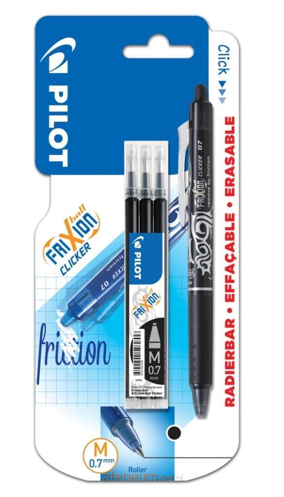 Czarne pióro kulkowe FriXion Clicker na blistrze, o rozmiarze końcówki piszącej 0.7, z 3 dodatkowymi wkładami. Pisz płynnie szeroką końcówką, wymaż silikonową gumką FriXion i zacznij od nowa! Bestseller marki Pilot pozwala na czyste pisanie i usuwanie atramentu poprzez pocieranie - wszystko za pomocą tego samego pisaka. Unikalny żelowy atrament reaguje na ciepło generowane przez pocieranie i pozwala natychmiast poprawić swój błąd!