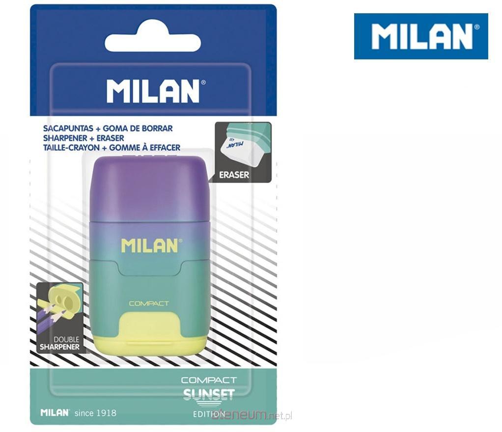 Fantazyjne połączenie gumki i temperówki w jednym. Z jednej strony podwójna temperówka na cienkie i grube kredki i ołówki. Z drugiej miękka gumka syntetyczna, a po środku pojemnik na ścinki. Wszystko w tęczowych kolorach i nowoczesnym designie nawiązującym do kolekcji SUNSET. Temperówka ma ostre i wytrzymałe stalowe ostrze, dzięki czemu idealnie nadaje się do wszystkich rodzajów ołówków. Posiada bezpieczny system ostrzy, który zapobiega odłączeniu się ostrza od korpusu temperówki. Kolory: zielony, fioletowy i żółty. Oryginalny projekt stworzony przez własny dział badawczo-rozwojowy MILAN. Wymiary: 6,7 x 4 x 2,5 cm.