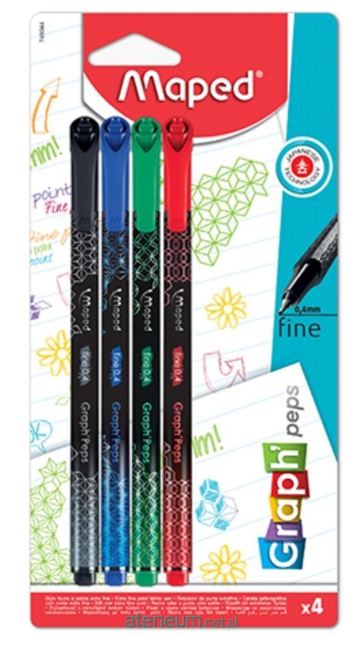 Cienkopis Graph'Peps Deco. Uniwersalna linia cienkopisów dla każdego, do użycia w szkole, w domu i w biurze. Końcówka oprawiona w metal. Grubość końcówki 0,4mm. Bezpieczna, wentylowana skuwka z klipsem. Ergonomiczny, trójkątny kształt poprawia komfort pisania. Korpus zdobiony błyszczącymi wzorami w kolorze tuszu. Blister 4 szt. kolory basic (czarny, niebieski, zielony, czerwony).