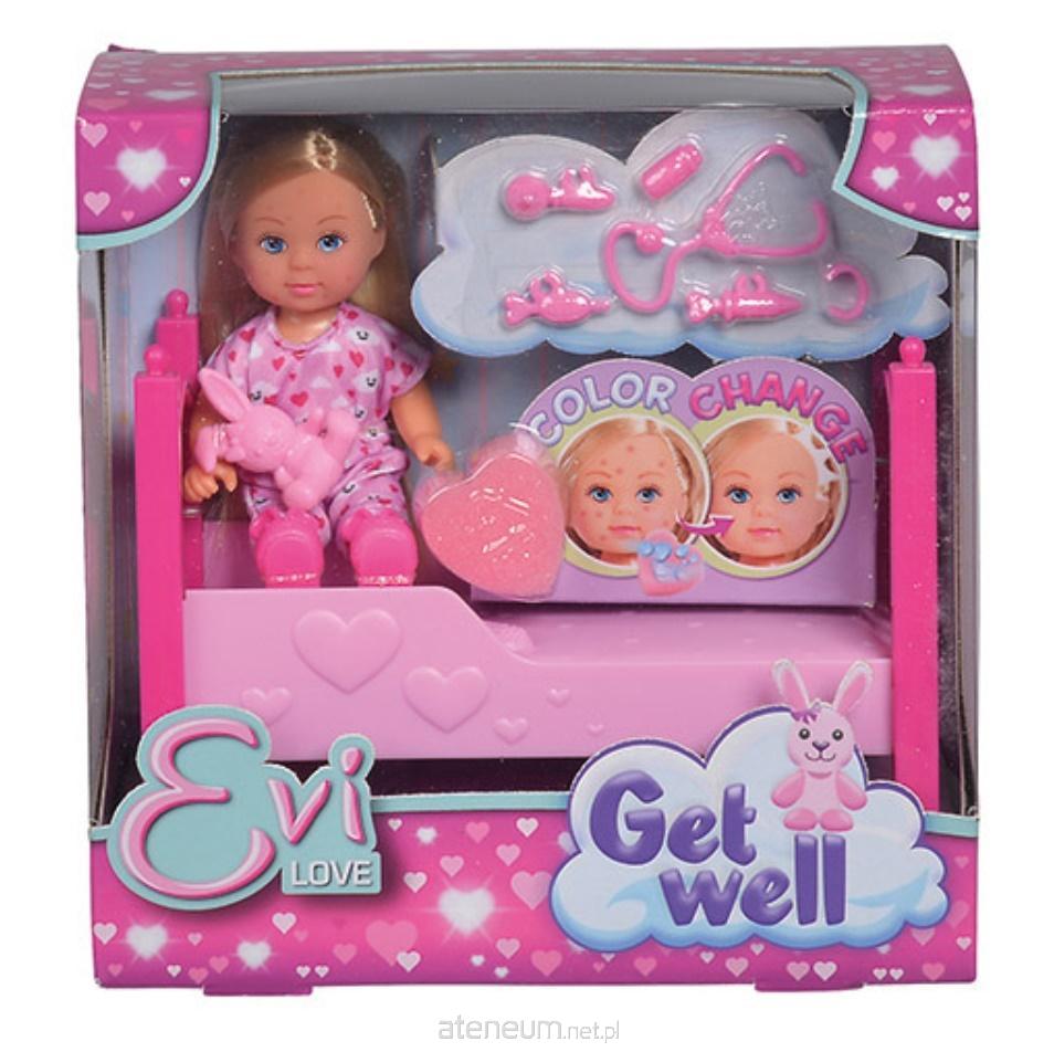 Laleczka Evi z wysypką na buzi, która znika po pocieraniu dołączoną gąbeczką, którą należy zanurzyć w wodzie (działa pod wpływem zmiany temperatury), w zestawie z łóżeczkiem, króliczkiem i akcesoriami do badania lekarskiego. Wysokość lalki: 12cm, 3 l+.