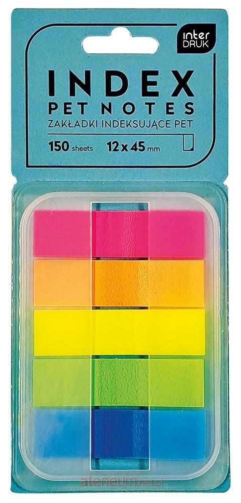 Zakładki indeksujące wielokrotnego użytku. Nie pozostawiają śladu po odklejeniu. Można po nich pisać. Wygodny podajnik umożliwia wyciągnięcie jednej karteczki na raz. Format zakładki: 12x45 mm. 5 kolorów. 150 szt.