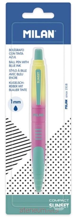 Długopis COMPACT niebieski z kolekcji SUNSET z obudową w kolorach tęczy. Pstrykany. Przybliżona długość pisania: 1000 metrów. Końcówka 1 mm. Atrament wyprodukowany w Niemczech. Oryginalny produkt stworzony przez własny dział badawczo-rozwojowy MILAN. 4 różne kolory obudowy: żółty, fioletowy, różowy i turkusowy. Rozmiar długopisu: 14,1 x 1,7 cm x 1,4 cm.