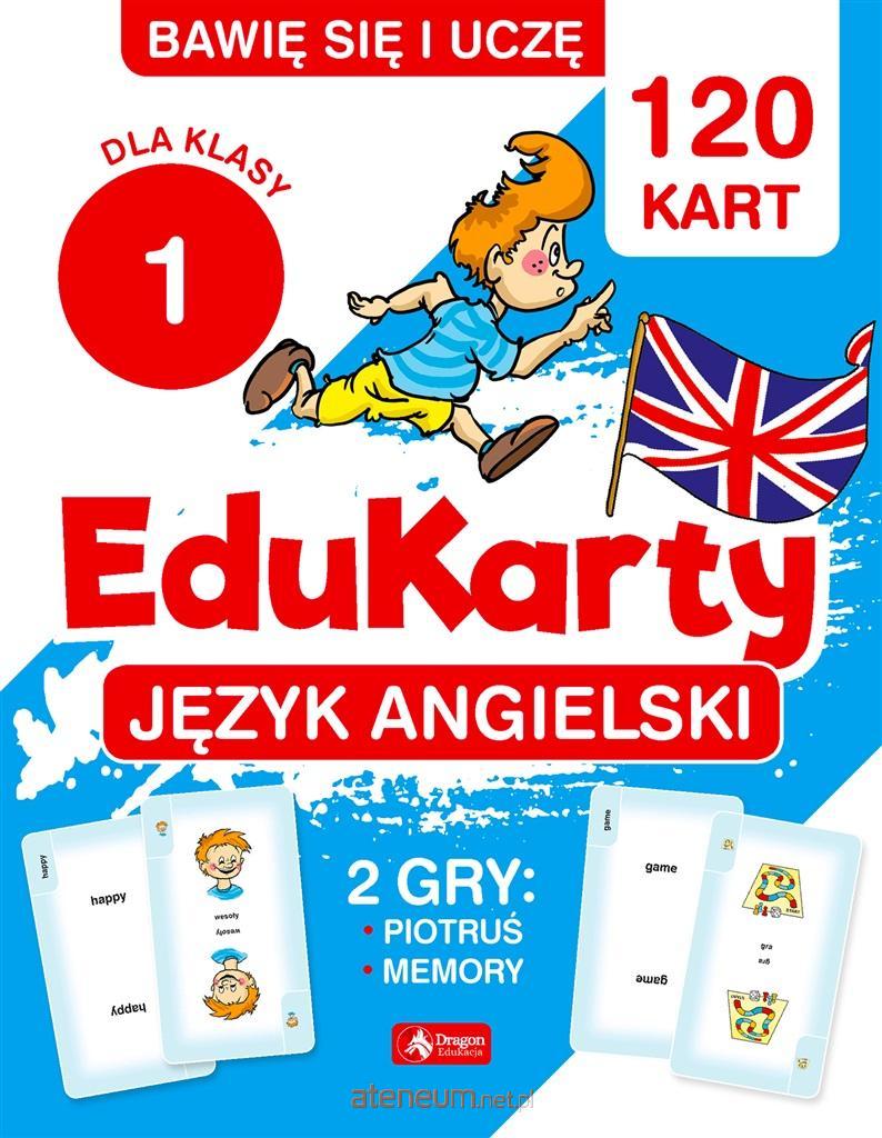 EduKarty. Język angielski to pomoc w nauce słownictwa języka angielskiego dla dzieci w klasach od zerówki do trzeciej. Zestaw przeznaczony jest do nauki w domu, w szkole i podczas kursów językowych. Zakres słownictwa obejmuje takie tematy jak części ciała, zabawki, szkoła, liczby, kolory czy pogoda. Zestaw zawiera: 120 kart, w tym 60 kart ze słówkami i 60 kart z ilustracjami. EduKarty zawierają także specjalny zestaw ćwiczeń-zabaw, które trenują mózg, aby lepiej się uczyć i łatwiej zapamiętywać materiał. 1 stronę z opisem gier i słowniczkiem