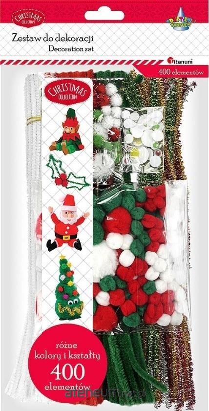 Zestaw 400 elementów: 120 drucików chenillowych (złote, czerwone, srebrne, zielone, czerwone, białe), 170 pomponów: akrylowe, poliestrowe, brokatowe, 30 ruchomych oczek kolorowych.