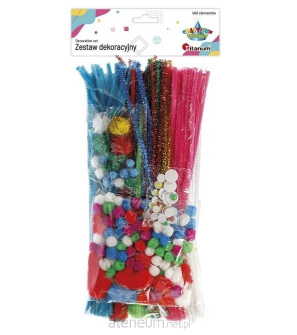 Zestaw 400 elementów: 120 drucików chenillowych, 170 pomponów: akrylowe, poliestrowe, brokatowe; 30 ruchomych oczek kolorowych.
