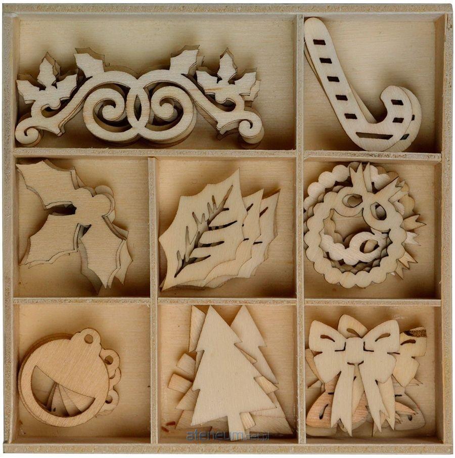 Drewniane elementy dekoracyjne świetnie nadają się do tworzenia zaproszeń, kartek okolicznościowych, pamiętników czy ozdób świątecznych. Można wykorzystać je do wykańczania wnętrz: zdobienia mebli, luster, okien, firan, przedmiotów wiklinowych oraz innych prac dekoratorskich. Stanowią doskonałe uzupełnienie dla techniki decoupage i scrapbooking. 9 wzorów w drewnianym pudełku o wymiarach 10,5 x 10,5 cm. Kształty: dekor, laska cukrowa, liść ostrokrzewu, liść, wianek, bombka, choinka, kokarda. 40 szt. kolor: naturalna