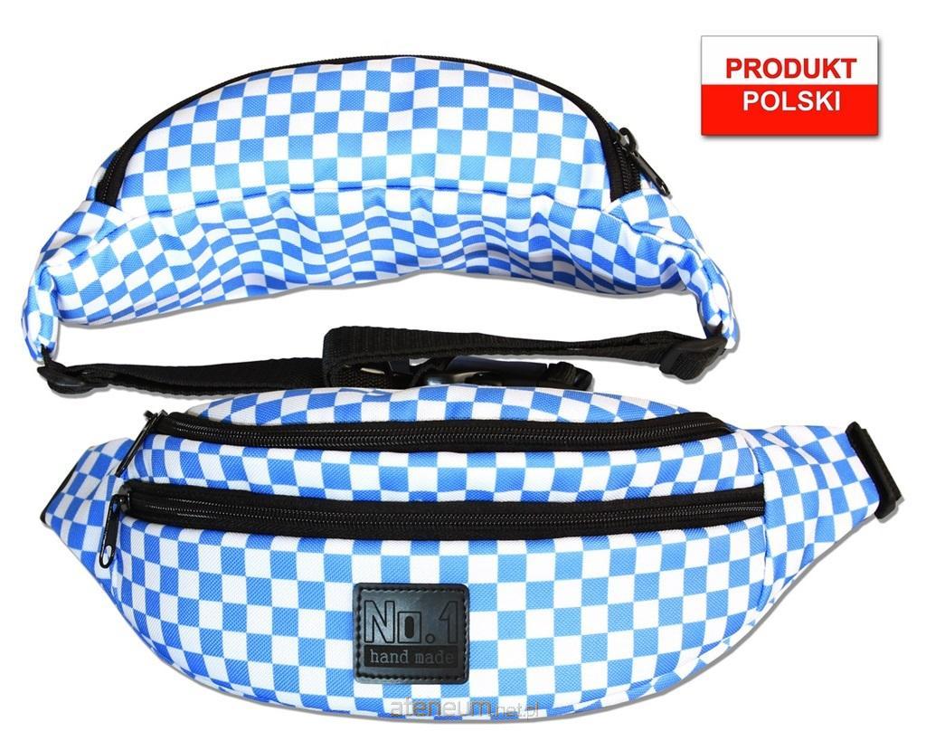 Saszetka/nerka wykonana z kodury, ozdobiona nadrukiem przedstawiającym kratę wykonanym w technologii sublimacji. Wyrób posiada 2 zamki błyskawiczne, a co za tym idzie 2 niezależne komory. Pasek posiada regulator umożliwiający dostosowanie długości paska do użytkownika. Wyrób o wymiarach 35x14x8[cm]. Kolor niebieski. Wyrób bez wyposażenia.